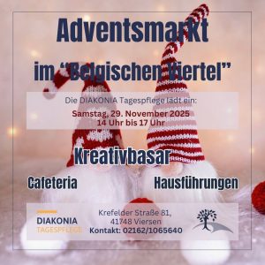 DIAKONIA Tagespflege lädt zum stimmungsvollen Adventsmarkt ein Am Samstag, den 29. November 2025, lädt die DIAKONIA Tagespflege im „Belgischen Viertel“ in Viersen von 14:00 bis 17:00 Uhr zu einem stimmungsvollen Advents- und Kreativmarkt ein. Besucherinnen und Besucher dürfen sich auf einen Nachmittag voller vorweihnachtlicher Atmosphäre, schöner Begegnungen und kreativer Ideen freuen. Mehr als 15 Ausstellerinnen …